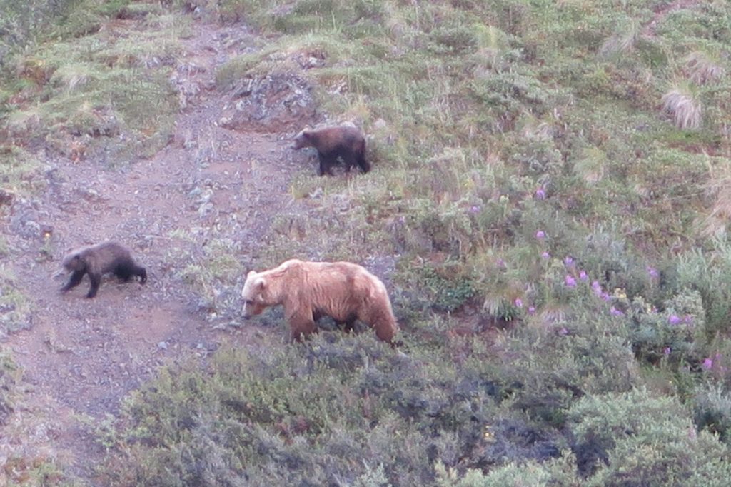 Wir sehen eine Grizzly Mutter mit Ihren Jungen.
